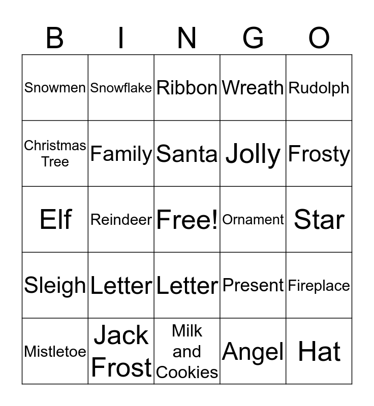 This bingo card has a free space and 24 words: Letter, Jack Frost, Santa, Mistletoe, Rudolph, Snowmen, Christmas Tree, Snowflake, Ornament, Letter, Jolly, Elf, Present, Fireplace, Family, Angel, Star, Ribbon, Frosty, Reindeer, Hat, Sleigh, Wreath and Milk and Cookies.