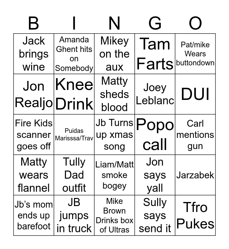 This bingo card has 34 words: Tfro Pukes, Sully says send it, Jb takes shirt off, Tfro Political Argument, Matty wears flannel, Knee Drink, Pat/mike Wears buttondown, Jb’s mom ends up barefoot, Amanda Ghent hits on Somebody, Mackenzie Cries, Matty sheds blood, Mikey on the aux, Sully takes down xmas tree, Jess yells at zane, Popo call, DUI, JB jumps in truck, Fire Kids scanner goes off, Tully Dad outfit, Jon says yall, Liam/Matt smoke bogey, Collas Cry, Jack brings wine, Carl mentions gun, Mike Brown Drinks box of Ultras, Jb Turns up xmas song, Tam Farts, Josh morehouse, Joey Leblanc, Jon Realjo, Shawn Heely, Puidas Marisssa/Trav, Jarzabek and Erin/Alexa.