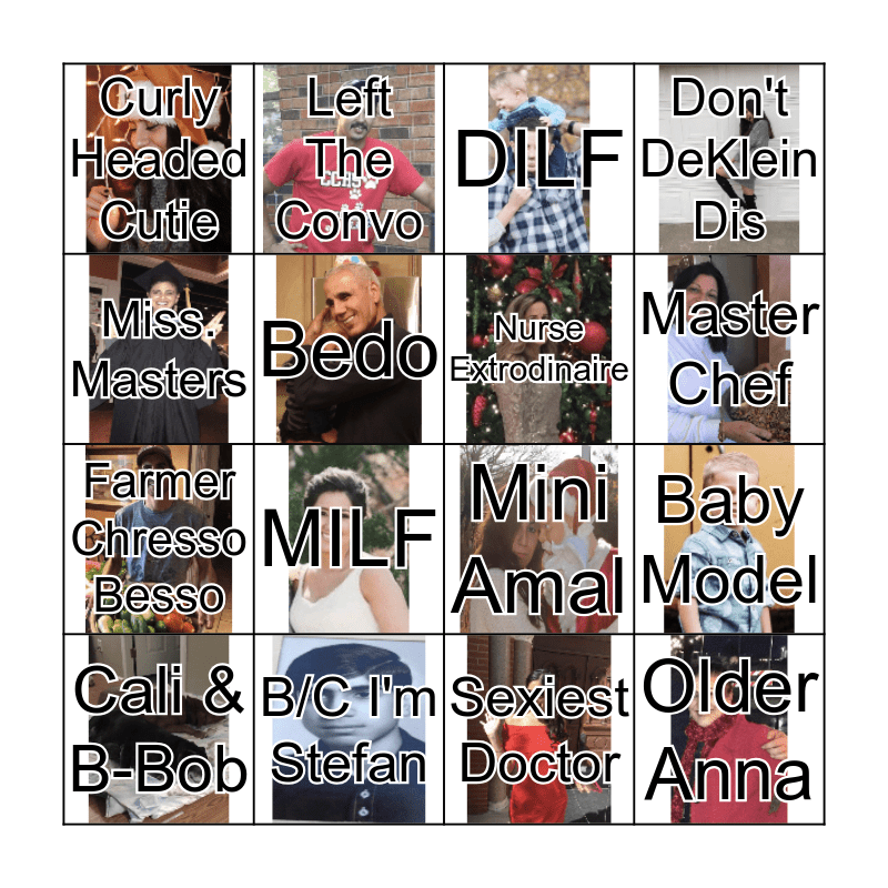 This bingo card has 16 images and 16 words: B/C I'm Stefan, Baby Model, DILF, Curly Headed Cutie, Farmer Chresso Besso, Left The Convo, Mini Amal, Sexiest Doctor, Miss. Masters, Bedo, Cali & B-Bob, Don't DeKlein Dis, MILF, Master Chef, Nurse Extrodinaire and Older Anna.