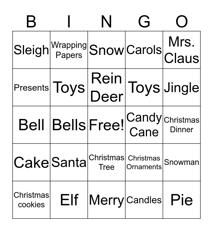 This bingo card has a free space and 24 words: Santa, Elf, Rein Deer, Christmas cookies, Mrs. Claus, Sleigh, Presents, Wrapping Papers, Candy Cane, Christmas Tree, Toys, Bell, Christmas Ornaments, Snowman, Toys, Candles, Christmas Dinner, Snow, Jingle, Bells, Pie, Cake, Carols and Merry.