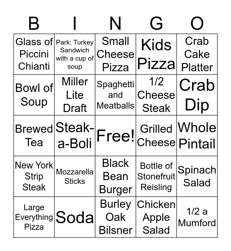 This bingo card has a free space and 24 words: Mozzarella Sticks, Soda, Spaghetti and Meatballs, Large Everything Pizza, Crab Cake Platter, Glass of Piccini Chianti, Bowl of Soup, Park: Turkey Sandwich with a cup of soup, Grilled Cheese, Black Bean Burger, 1/2 Cheese Steak, Brewed Tea, Bottle of Stonefruit Reisling, Spinach Salad, Miller Lite Draft, Chicken Apple Salad, Whole Pintail, Small Cheese Pizza, Crab Dip, Steak-a-Boli, 1/2 a Mumford, New York Strip Steak, Kids Pizza and Burley Oak Bilsner.