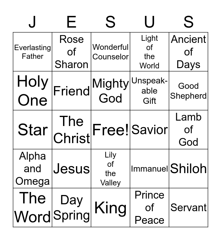 This bingo card has a free space and 24 words: Jesus, Day Spring, Mighty God, The Word, Ancient of Days, Everlasting Father, Holy One, Rose of Sharon, Savior, Lily of the Valley, Unspeak- able Gift, Star, Immanuel, Shiloh, Friend, Prince of Peace, Lamb of God, Wonderful Counselor, Good Shepherd, The Christ, Servant, Alpha and Omega, Light of the World and King.