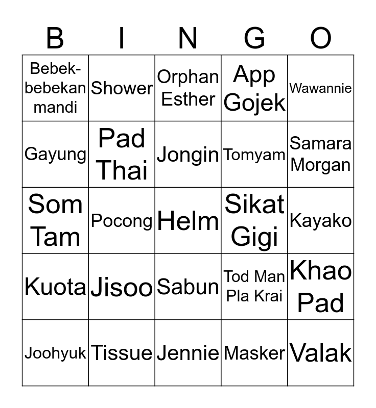 This bingo card has 25 words: Jisoo, Jennie, Jongin, Joohyuk, Wawannie, Bebek-bebekan mandi, Gayung, Shower, Sikat Gigi, Sabun, Tomyam, Som Tam, Tod Man Pla Krai, Khao Pad, Pad Thai, Valak, Kayako, Orphan Esther, Samara Morgan, Pocong, Helm, Tissue, Kuota, App Gojek and Masker.
