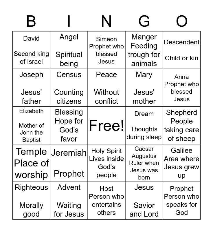 This bingo card has a free space and 24 words: Jeremiah Prophet, Advent Waiting for Jesus, Peace Without conflict, Righteous Morally good, Descendent Child or kin, David Second king of Israel, Joseph Jesus' father, Angel Spiritual being, Dream Thoughts during sleep, Holy Spirit Lives inside God's people, Mary Jesus' mother, Elizabeth Mother of John the Baptist, Caesar Augustus Ruler when Jesus was born, Galilee Area where Jesus grew up, Census Counting citizens, Jesus Savior and Lord, Shepherd People taking care of sheep, Simeon Prophet who blessed Jesus, Anna Prophet who blessed Jesus, Blessing Hope for God's favor, Prophet Person who speaks for God, Temple Place of worship, Manger Feeding trough for animals and Host Person who entertains others.