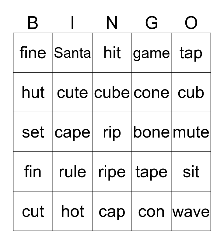 This bingo card has 25 words: rule, cap, cube, cut, tap, fine, hut, Santa, bone, ripe, cone, set, tape, sit, cute, wave, mute, hit, cub, cape, rip, hot, fin, game and con.