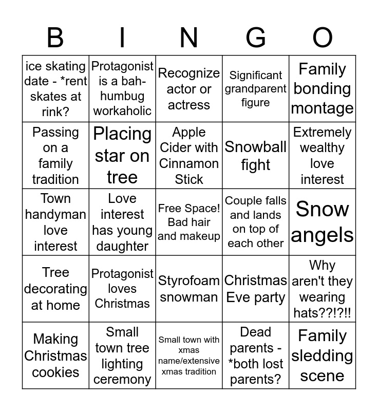 This bingo card has a free space and 24 words: Protagonist loves Christmas, Small town tree lighting ceremony, Apple Cider with Cinnamon Stick, Making Christmas cookies, Family bonding montage, ice skating date - *rent skates at rink?, Passing on a family tradition, Protagonist is a bah-humbug workaholic, Couple falls and lands on top of each other, Styrofoam snowman, Snowball fight, Town handyman love interest, Christmas Eve party, Why aren't they wearing hats??!?!!, Placing star on tree, Dead parents - *both lost parents?, Snow angels, Recognize actor or actress, Extremely wealthy love interest, Love interest has young daughter, Family sledding scene, Tree decorating at home, Significant grandparent figure and Small town with xmas name/extensive xmas tradition.