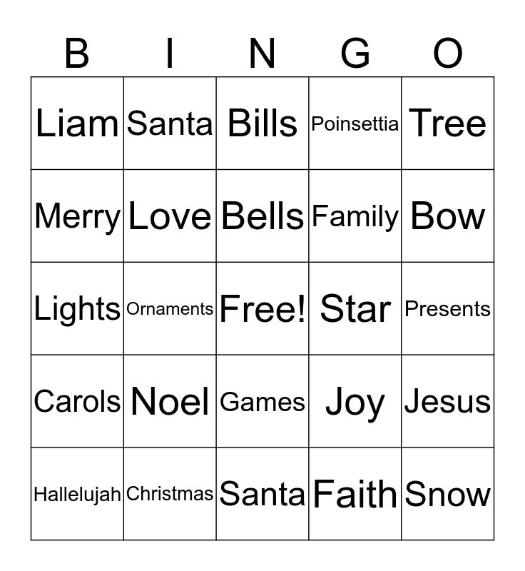 This bingo card has a free space and 24 words: Noel, Christmas, Bells, Hallelujah, Tree, Liam, Merry, Santa, Star, Games, Family, Lights, Joy, Jesus, Love, Faith, Presents, Bills, Bow, Ornaments, Snow, Carols, Poinsettia and Santa.