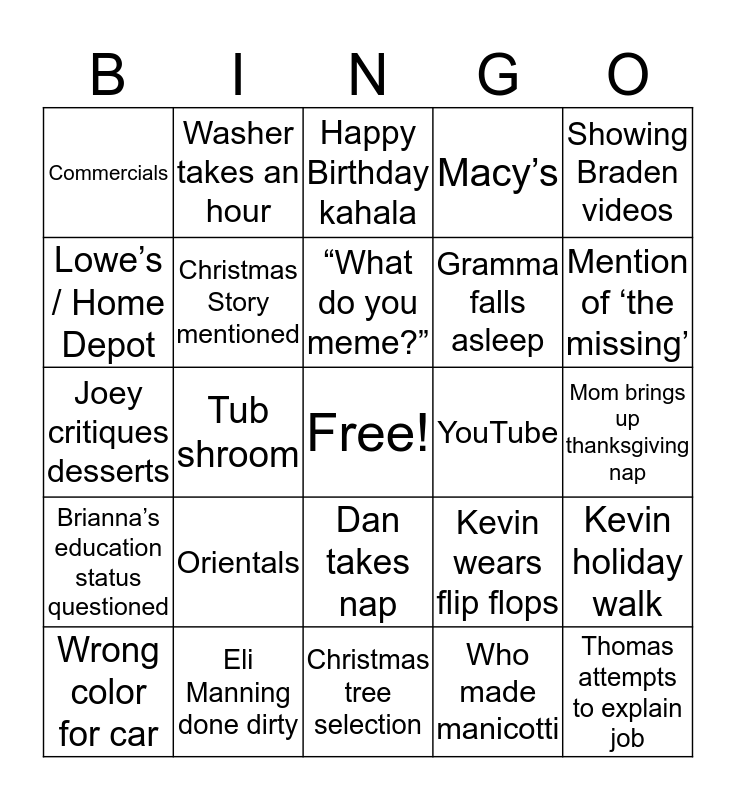 This bingo card has a free space and 24 words: Orientals, Eli Manning done dirty, “What do you meme?”, Wrong color for car, Showing Braden videos, Commercials, Lowe’s / Home Depot, Washer takes an hour, YouTube, Dan takes nap, Gramma falls asleep, Joey critiques desserts, Kevin wears flip flops, Kevin holiday walk, Christmas Story mentioned, Who made manicotti, Mom brings up thanksgiving nap, Happy Birthday kahala, Mention of ‘the missing’, Tub shroom, Thomas attempts to explain job, Brianna’s education status questioned, Macy’s and Christmas tree selection.