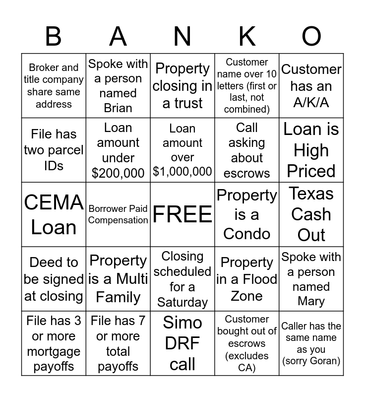 This bingo card has a free space and 24 words: Property is a Multi Family, File has 7 or more total payoffs, Loan amount over $1,000,000, File has 3 or more mortgage payoffs, Customer has an A/K/A, Broker and title company share same address, File has two parcel IDs, Spoke with a person named Brian, Property is a Condo, Closing scheduled for a Saturday, Call asking about escrows, CEMA Loan, Property in a Flood Zone, Spoke with a person named Mary, Loan amount under $200,000, Customer bought out of escrows (excludes CA), Texas Cash Out, Property closing in a trust, Loan is High Priced, Borrower Paid Compensation, Caller has the same name as you (sorry Goran), Deed to be signed at closing, Customer name over 10 letters (first or last, not combined) and Simo DRF call.
