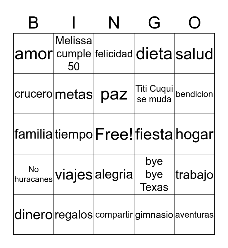 This bingo card has a free space and 24 words: viajes, regalos, paz, dinero, salud, amor, crucero, Melissa cumple 50, fiesta, alegria, Titi Cuqui se muda, familia, bye bye Texas, trabajo, metas, gimnasio, hogar, felicidad, bendicion, tiempo, aventuras, No huracanes, dieta and compartir.