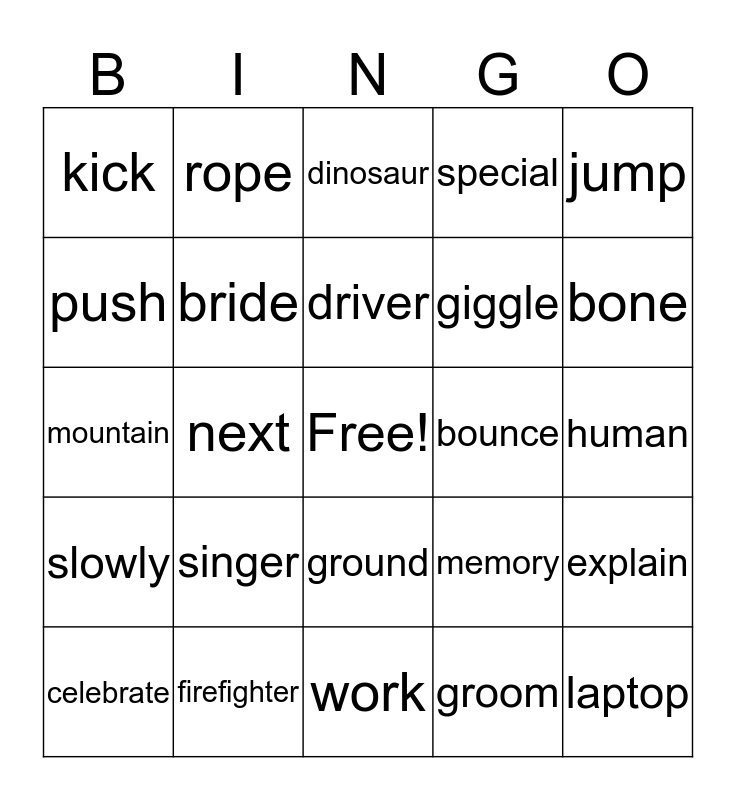 This bingo card has a free space and 24 words: singer, firefighter, driver, celebrate, jump, kick, push, rope, bounce, ground, giggle, mountain, memory, explain, bride, groom, human, dinosaur, bone, next, laptop, slowly, special and work.
