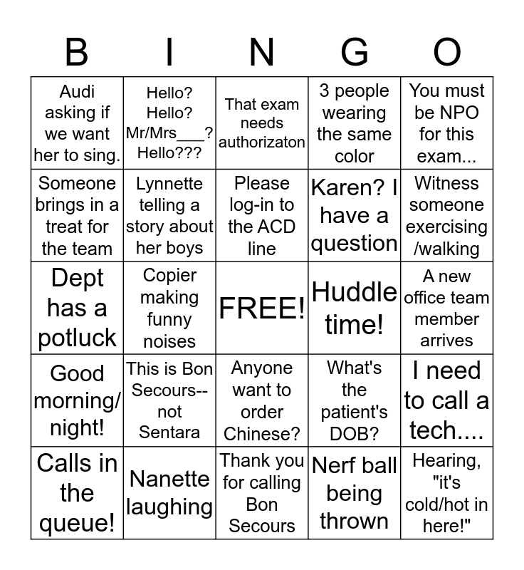 This bingo card has a free space and 24 words: This is Bon Secours--not Sentara, Nanette laughing, Please log-in to the ACD line, Calls in the queue!, You must be NPO for this exam..., Audi asking if we want her to sing., Someone brings in a treat for the team, Hello? Hello? Mr/Mrs___? Hello???, Huddle time!, Anyone want to order Chinese?, Karen? I have a question, Dept has a potluck, What's the patient's DOB?, I need to call a tech...., Lynnette telling a story about her boys, Nerf ball being thrown, A new office team member arrives, That exam needs authorizaton, Witness someone exercising /walking, Copier making funny noises, Hearing, "it's cold/hot in here!", Good morning/ night!, 3 people wearing the same color and Thank you for calling Bon Secours.
