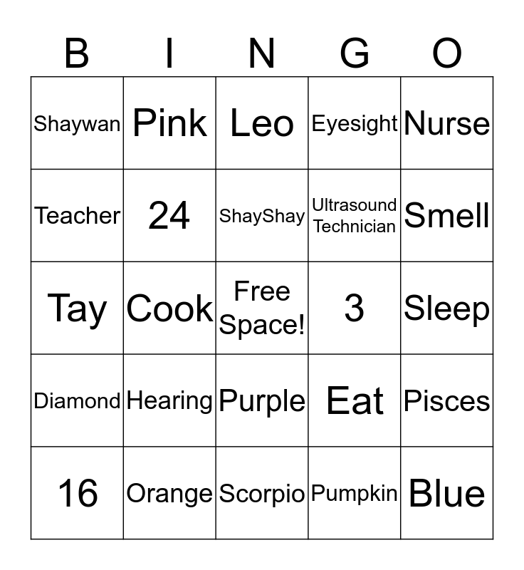 This bingo card has a free space and 24 words: 16, Hearing, ShayShay, Pumpkin, Nurse, Shaywan, Pink, Leo, 3, Sleep, Tay, 24, Eat, Pisces, Teacher, Orange, Scorpio, Eyesight, Smell, Diamond, Cook, Purple, Ultrasound Technician and Blue.