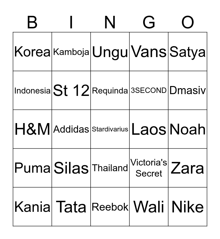 This bingo card has a free space and 24 words: Silas, Tata, Requinda, Kania, Satya, Korea, Indonesia, Kamboja, Laos, Thailand, 3SECOND, H&M, Victoria's Secret, Zara, St 12, Wali, Noah, Ungu, Dmasiv, Addidas, Nike, Puma, Vans and Reebok.
