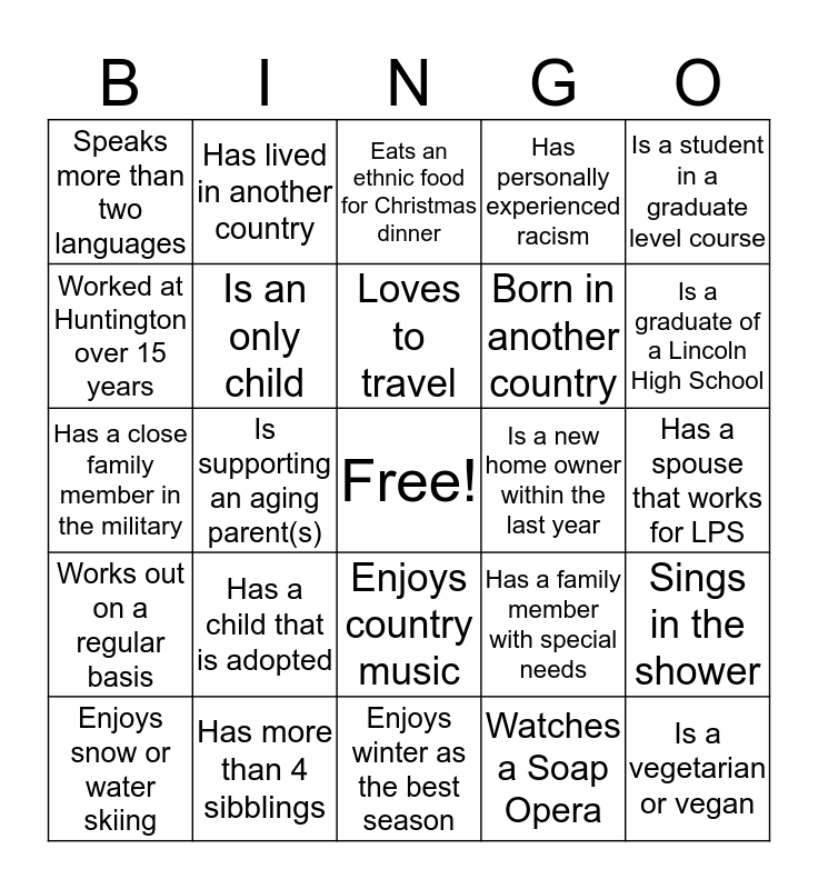 This bingo card has a free space and 24 words: Has a child that is adopted, Has more than 4 sibblings, Loves to travel, Enjoys snow or water skiing, Is a student in a graduate level course, Speaks more than two languages, Worked at Huntington over 15 years, Has lived in another country, Is a new home owner within the last year, Enjoys country music, Born in another country, Has a close family member in the military, Has a family member with special needs, Sings in the shower, Is an only child, Watches a Soap Opera, Has a spouse that works for LPS, Eats an ethnic food for Christmas dinner, Is a graduate of a Lincoln High School, Is supporting an aging parent(s), Is a vegetarian or vegan, Works out on a regular basis, Has personally experienced racism and Enjoys winter as the best season.