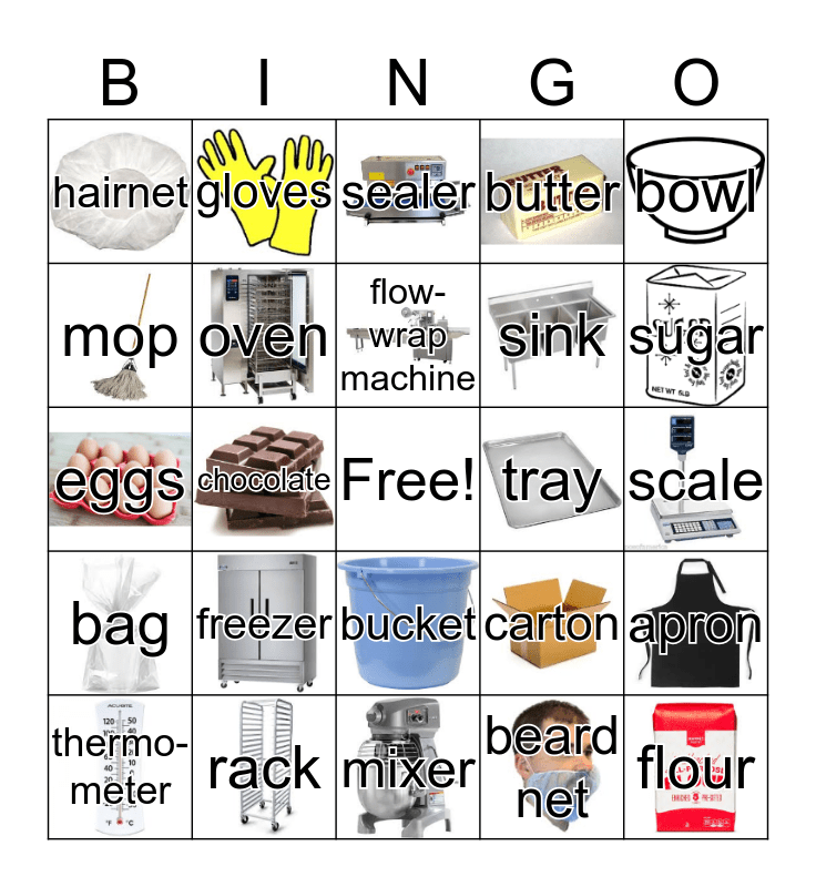 This bingo card has 24 images, a free space and 24 words: freezer, rack, flow-wrap machine, thermo-meter, bowl, hairnet, mop, gloves, tray, bucket, sink, eggs, carton, apron, oven, beard net, scale, sealer, sugar, chocolate, flour, bag, butter and mixer.