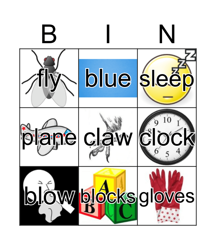 This bingo card has 9 images and 9 words: blow, sleep, blue, plane, fly, clock, claw, gloves and blocks.