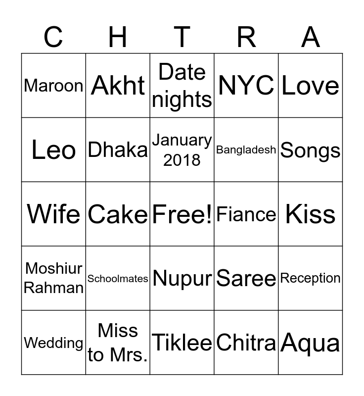 This bingo card has a free space and 60 words: Miss Jahangir, Miss to Mrs., Future Mrs. Rahman, Moshiur Rahman, Chitra, Tasmina Jahangir, Dhaka, London, Bangladesh, Bali, NYC, Officer's Club, Leo, Aquarius, Blue, Maroon, Aqua, Love, Rings, January 2018, Fiance, Date nights, Wedding, Reception, Gaye Holud, Mehendi, Flowers, Speeches, Songs, Vows, Happy, Videographer, Photographer, Honeymoon, Akht, Diamond, Coffee, Cake, Sweets, Wife, Husband, Schoolmates, Kiss, Jewelry, Saree, Lehenga, Sherwani, Pagri, Nagra, Nupur, Tiklee, Nath, Tip, Alta, Choori, Tapa, Palki, Jhumka, Chandan and Honeymoon.