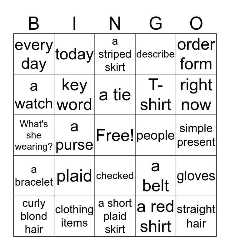 This bingo card has a free space and 44 words: long brown hair, straight hair, a jogging suit, curly blond hair, short hair, a red shirt, a striped skirt, soccer, order form, clothing items, describe, people, checked, plaid, striped, a short plaid skirt, a long black and white coat, What's she wearing?, now, right now, today, always, usually, every day, What are you doing right now?, simple present, present continuous, What do you do every Tuesday?, a belt, a bracelet, earrings, gloves, a hat, a necklace, a purse, a ring, a scarf, sunglasses, a tie, a watch, T-shirt, athletic, key word and Let's stay in touch..
