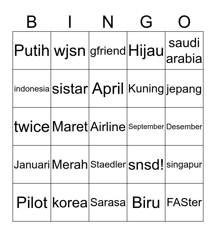 This bingo card has 25 words: Merah, Sarasa, April, Pilot, saudi arabia, Putih, indonesia, wjsn, September, Staedler, Kuning, twice, snsd!, singapur, sistar, FASter, Desember, gfriend, jepang, Maret, Airline, korea, Januari, Hijau and Biru.