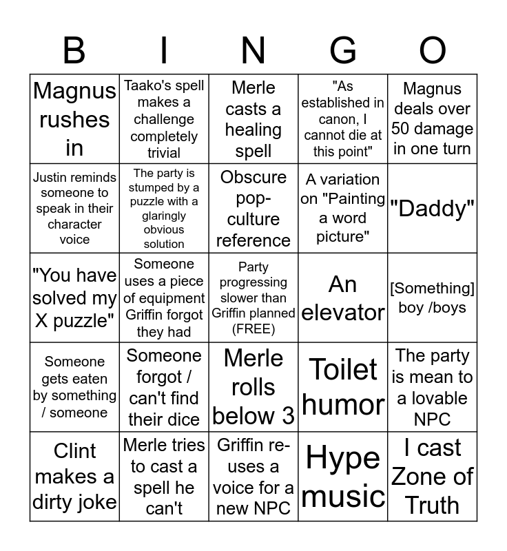 This bingo card has a free space and 24 words: Someone forgot / can't find their dice, Merle tries to cast a spell he can't, Obscure pop-culture reference, Clint makes a dirty joke, Magnus deals over 50 damage in one turn, Magnus rushes in, Justin reminds someone to speak in their character voice, Taako's spell makes a challenge completely trivial, An elevator, Merle rolls below 3, A variation on "Painting a word picture", "You have solved my X puzzle", Toilet humor, The party is mean to a lovable NPC, The party is stumped by a puzzle with a glaringly obvious solution, Hype music, [Something] boy /boys, Merle casts a healing spell, "Daddy", Someone uses a piece of equipment Griffin forgot they had, I cast Zone of Truth, Someone gets eaten by something / someone, "As established in canon, I cannot die at this point" and Griffin re-uses a voice for a new NPC.