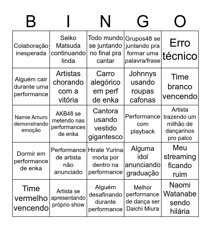 This bingo card has 25 words: Dormir em performance de enka, Artista se apresentando próprio show, Cantora usando vestido gigantesco, Melhor performance de dança ser Daichi Miura, Erro técnico, Colaboração inesperada, Seiko Matsuda continuando linda, Todo mundo se juntando no final pra cantar, Performance com playback, Meu streaming ficando ruim, Alguém cair durante uma performance, Artistas chorando com a vitória, Alguém desafinando durante performance, Alguma idol anunciando graduação, Time branco vencendo, Time vermelho vencendo, AKB48 se metendo nas performances de enka, Carro alegórico em perf de enka, Johnnys usando roupas cafonas, Artista trazendo um milhão de dançarinos pro palco, Namie Amuro demonstrando emoção, Performance de artista não anunciado, Hirate Yurina morta por dentro na performance, Grupos48 se juntando pra formar uma palavra/frase and Naomi Watanabe sendo hilária.