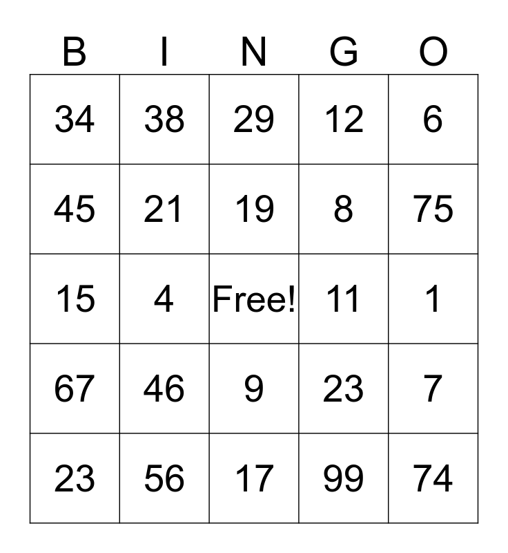This bingo card has a free space and 24 words: 23, 46, 19, 99, 6, 34, 38, 29, 11, 1, 15, 21, 23, 7, 45, 56, 17, 12, 75, 67, 4, 9, 8 and 74.