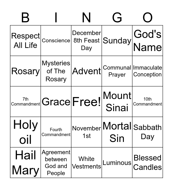 This bingo card has a free space and 24 words: Fourth Commandment, Agreement between God and People, Advent, Hail Mary, God's Name, Respect All Life, Rosary, Conscience, Mount Sinai, November 1st, Communal Prayer, 7th Commandment, Mortal Sin, Sabbath Day, Mysteries of The Rosary, Luminous, 10th Commandment, December 8th Feast Day, Immaculate Conception, Grace, Blessed Candles, Holy oil, Sunday and White Vestments.
