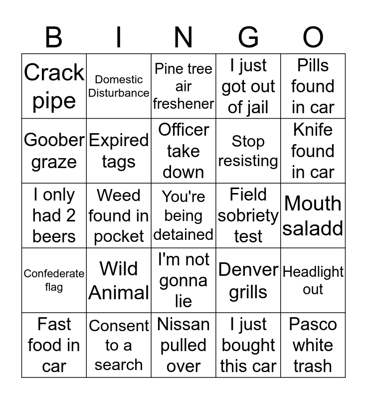 This bingo card has a free space and 24 words: Wild Animal, Consent to a search, Officer take down, Fast food in car, Pills found in car, Crack pipe, Goober graze, Domestic Disturbance, Field sobriety test, I'm not gonna lie, Stop resisting, I only had 2 beers, Denver grills, Headlight out, Expired tags, I just bought this car, Mouth saladd, Pine tree air freshener, Knife found in car, Weed found in pocket, Pasco white trash, Confederate flag, I just got out of jail and Nissan pulled over.