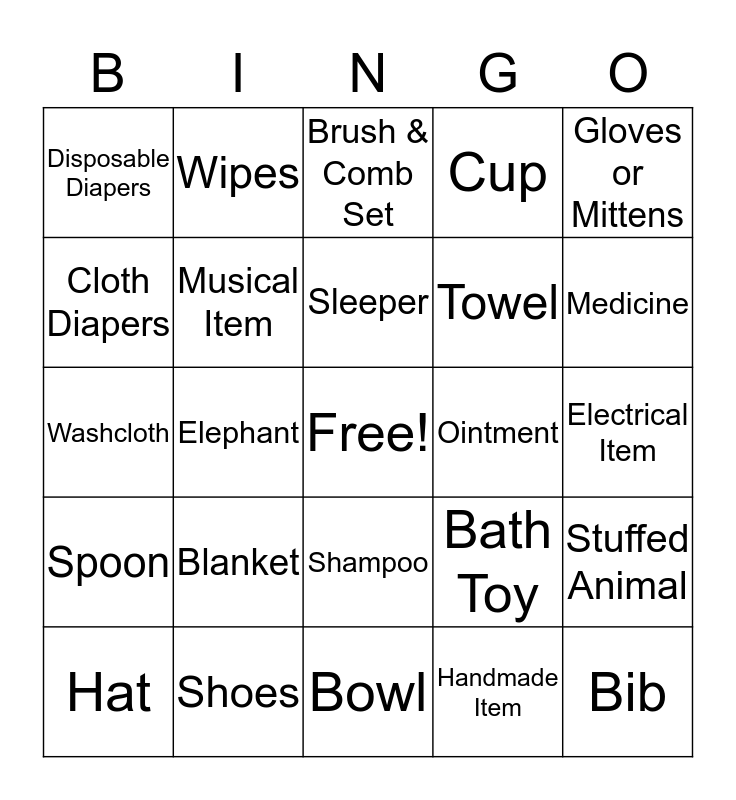 This bingo card has a free space and 24 words: Blanket, Shoes, Sleeper, Hat, Gloves or Mittens, Disposable Diapers, Cloth Diapers, Wipes, Ointment, Shampoo, Towel, Washcloth, Bath Toy, Stuffed Animal, Musical Item, Handmade Item, Electrical Item, Brush & Comb Set, Medicine, Elephant, Bib, Spoon, Cup and Bowl.