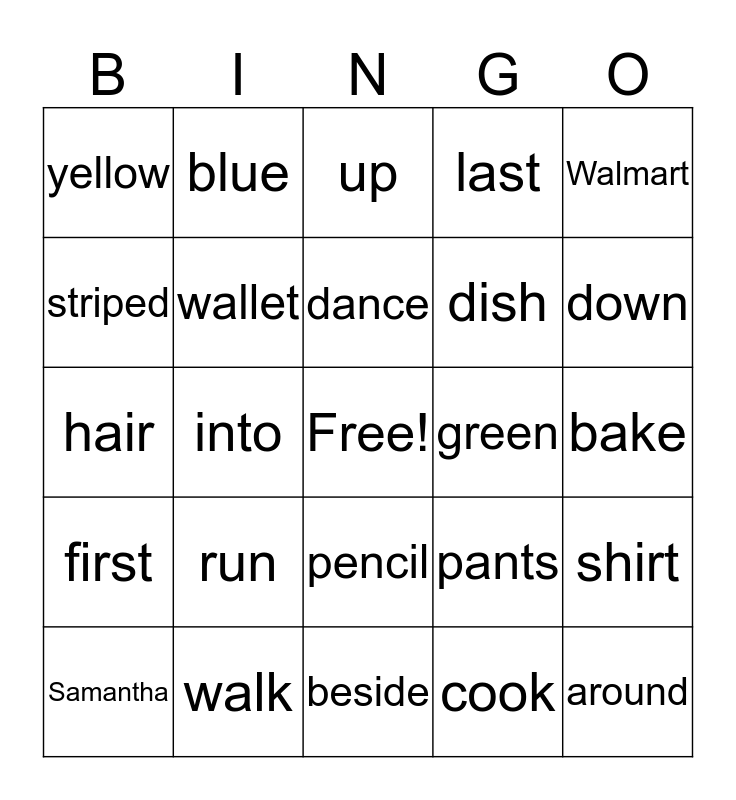 This bingo card has a free space and 24 words: run, walk, dance, Samantha, Walmart, yellow, striped, blue, green, pencil, dish, hair, pants, shirt, wallet, cook, bake, up, down, into, around, first, last and beside.