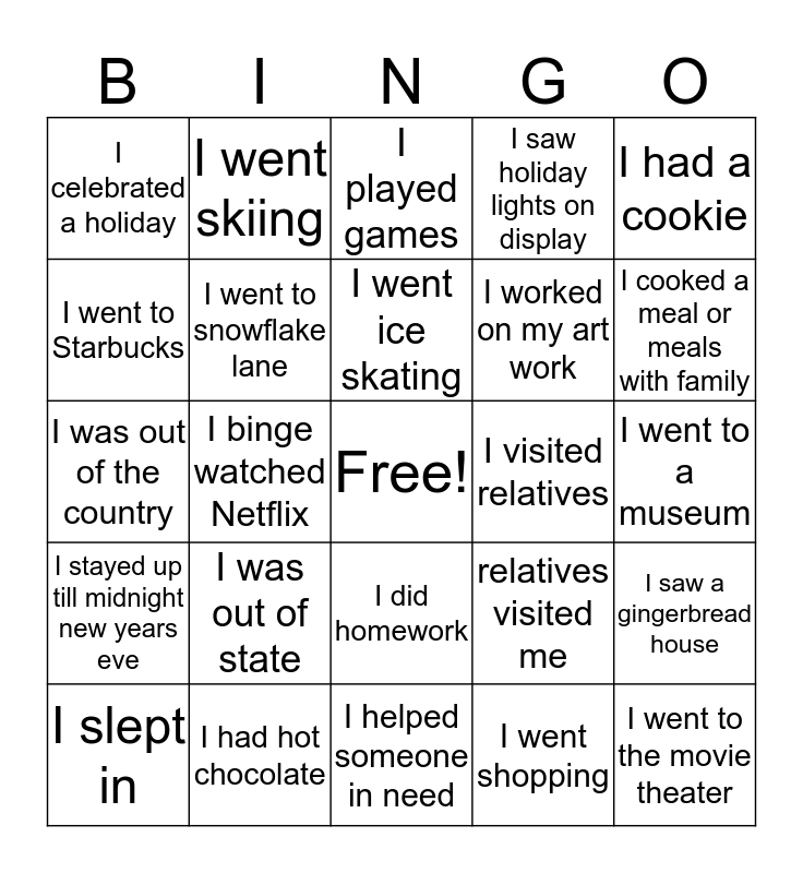 This bingo card has a free space and 24 words: I was out of state, I had hot chocolate, I went ice skating, I slept in, I had a cookie, I celebrated a holiday, I went to Starbucks, I went skiing, I visited relatives, I did homework, I worked on my art work, I was out of the country, relatives visited me, I saw a gingerbread house, I went to snowflake lane, I went shopping, I went to a museum, I played games, I cooked a meal or meals with family, I binge watched Netflix, I went to the movie theater, I stayed up till midnight new years eve, I saw holiday lights on display and I helped someone in need.
