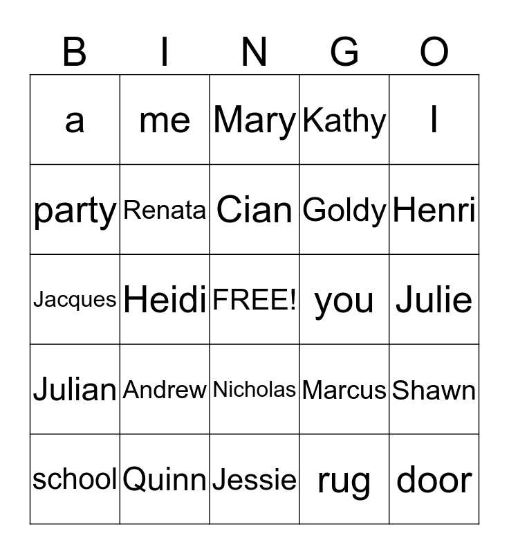 This bingo card has a free space and 24 words: Andrew, Quinn, Cian, school, I, a, party, me, you, Nicholas, Goldy, Jacques, Marcus, Shawn, Renata, rug, Julie, Mary, Henri, Heidi, door, Julian, Kathy and Jessie.
