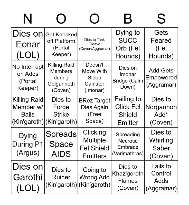 This bingo card has a free space and 24 words: Spreads Space AIDS, Dies to Ruiner (Kin'garoth), Doesn't Move With Sleep Canister (Imonar), Dies on Garothi (LOL), Gets Feared (Fel Hounds), Dies on Eonar (LOL), No Interrupt on Adds (Portal Keeper), Get Knocked off Platform (Portal Keeper), Failing to Click Fel Shield Emitter, Clicking Multiple Fel Shield Emitters, Dies on Imonar Bridge (Calm Down), Killing Raid Member w/ Balls (Kin'garoth), Spreading Necrotic Embrace (Varimathras), Dies to Whirling Saber (Coven), Killing Raid Members during Golganneth (Coven), Dies to Khaz'goroth Flames (Coven), Dies to Norgannon Add* (Coven), Dies to Tank Cleave (Coven/Aggramar), Add Gets Empowered (Aggramar), Dies to Forge Strike (Kin'garoth), Fails to Control Adds (Aggramar), Dying During P1 (Argus), Dying to SUCC Orb (Fel Hounds) and Going to Wrong Add (Kin'garoth).