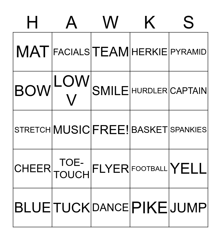 This bingo card has a free space and 24 words: BLUE, TOE-TOUCH, SMILE, PIKE, PYRAMID, MAT, FACIALS, TEAM, BASKET, SPANKIES, STRETCH, LOW V, FOOTBALL, YELL, BOW, TUCK, DANCE, HERKIE, CAPTAIN, CHEER, MUSIC, FLYER, HURDLER and JUMP.