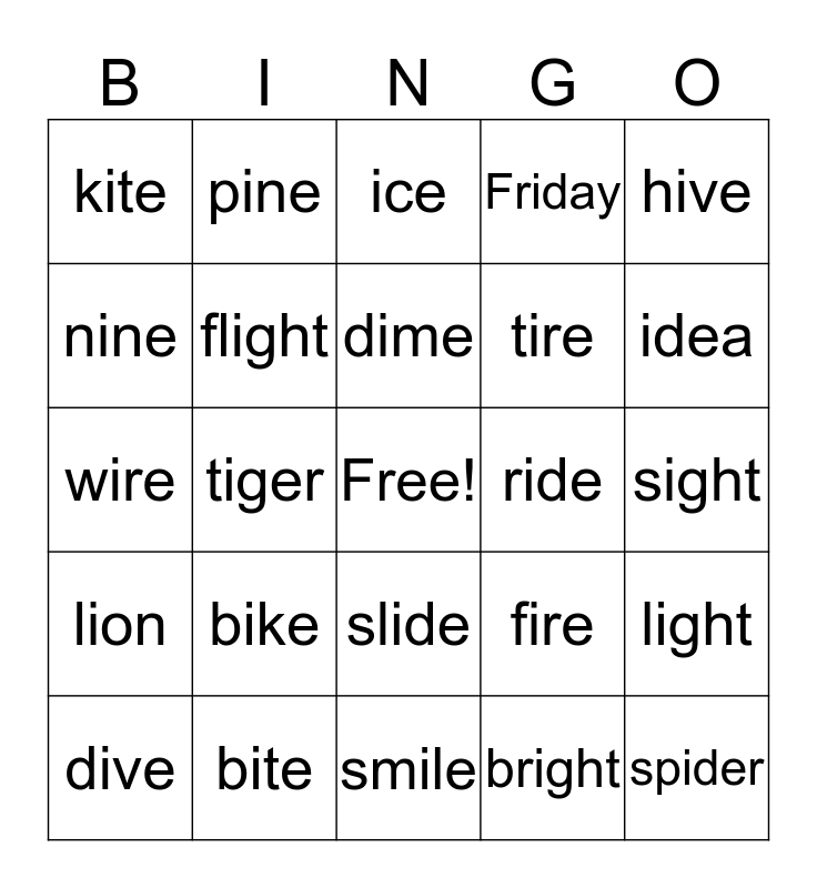 This bingo card has a free space and 24 words: bike, bite, dime, dive, hive, kite, nine, pine, ride, slide, tire, wire, fire, light, flight, bright, sight, ice, idea, tiger, spider, lion, Friday and smile.