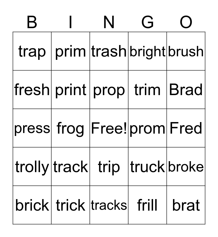 This bingo card has a free space and 24 words: track, trick, prop, brick, brush, trap, fresh, prim, prom, trip, trim, press, truck, broke, print, frill, Fred, trash, Brad, frog, brat, trolly, bright and tracks.