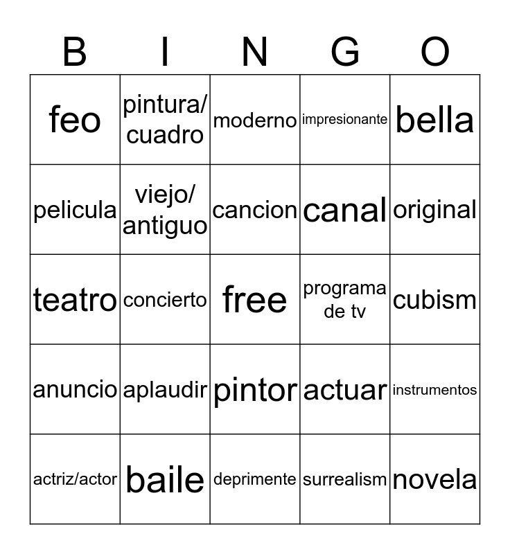 This bingo card has a free space and 24 words: aplaudir, baile, cancion, actriz/actor, bella, feo, pelicula, pintura/ cuadro, programa de tv, pintor, canal, teatro, actuar, instrumentos, viejo/ antiguo, surrealism, cubism, moderno, original, concierto, novela, anuncio, impresionante and deprimente.