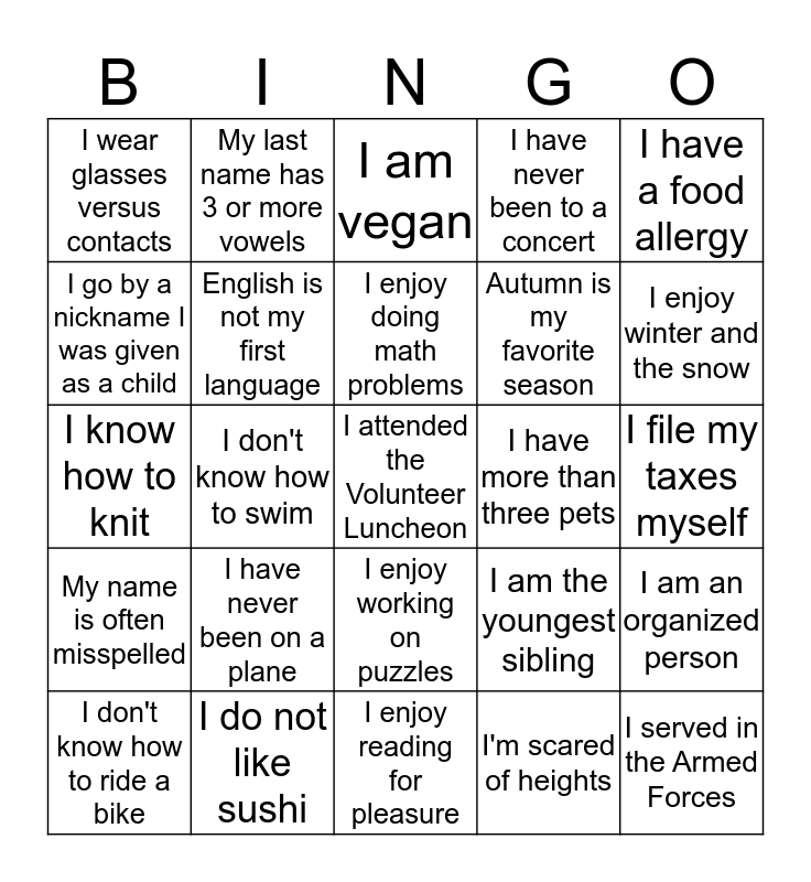 This bingo card has a free space and 34 words: I know how to play a musical instrument, I'm scared of heights, I don't like chocolate, I've traveled out of the country, My name is often misspelled, English is not my first language, I have a food allergy, I don't know how to ride a bike, My last name has 3 or more vowels, I enjoy opera music, I enjoy doing math problems, I am vegan, I floss my teeth everyday, I have been scuba diving, I have more than three pets, I enjoy winter and the snow, I do not like sushi, I know how to knit, I have never been on a plane, I am the youngest sibling, I enjoy working on puzzles, I am left-handed, I wear glasses versus contacts, I file my taxes myself, I enjoy reading for pleasure, I served in the Armed Forces, I have never been to a concert, I don't like to watch TV, Autumn is my favorite season, I go by a nickname I was given as a child, I am a grandparent, I don't know how to swim, I am an organized person and I prefer baths versus showers.