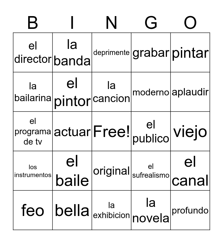 This bingo card has a free space and 24 words: el baile, bella, la cancion, feo, pintar, el director, la bailarina, la banda, el publico, original, moderno, el programa de tv, el sufrealismo, el canal, el pintor, la novela, viejo, deprimente, aplaudir, actuar, profundo, los instrumentos, grabar and la exhibicion.