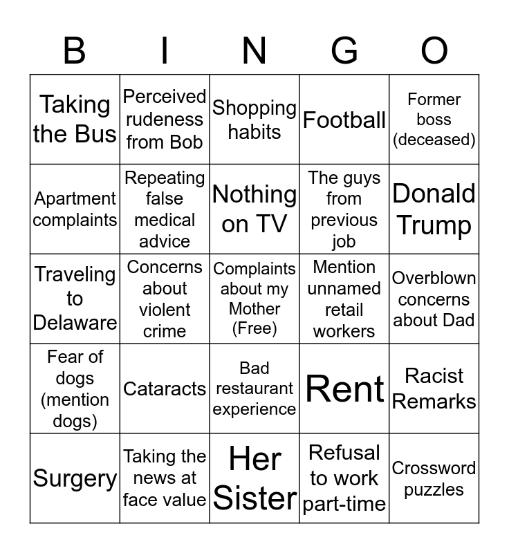 This bingo card has a free space and 24 words: Cataracts, Taking the news at face value, Nothing on TV, Surgery, Former boss (deceased), Taking the Bus, Apartment complaints, Perceived rudeness from Bob, Mention unnamed retail workers, Bad restaurant experience, The guys from previous job, Traveling to Delaware, Rent, Racist Remarks, Repeating false medical advice, Refusal to work part-time, Overblown concerns about Dad, Shopping habits, Donald Trump, Concerns about violent crime, Crossword puzzles, Fear of dogs (mention dogs), Football and Her Sister.
