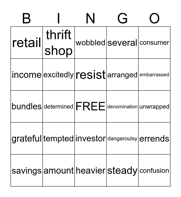 This bingo card has a free space and 24 words: tempted, amount, resist, savings, consumer, retail, income, thrift shop, denomination, investor, arranged, bundles, dangeroulsy, errends, excitedly, steady, unwrapped, wobbled, embarrassed, determined, confusion, grateful, several and heavier.