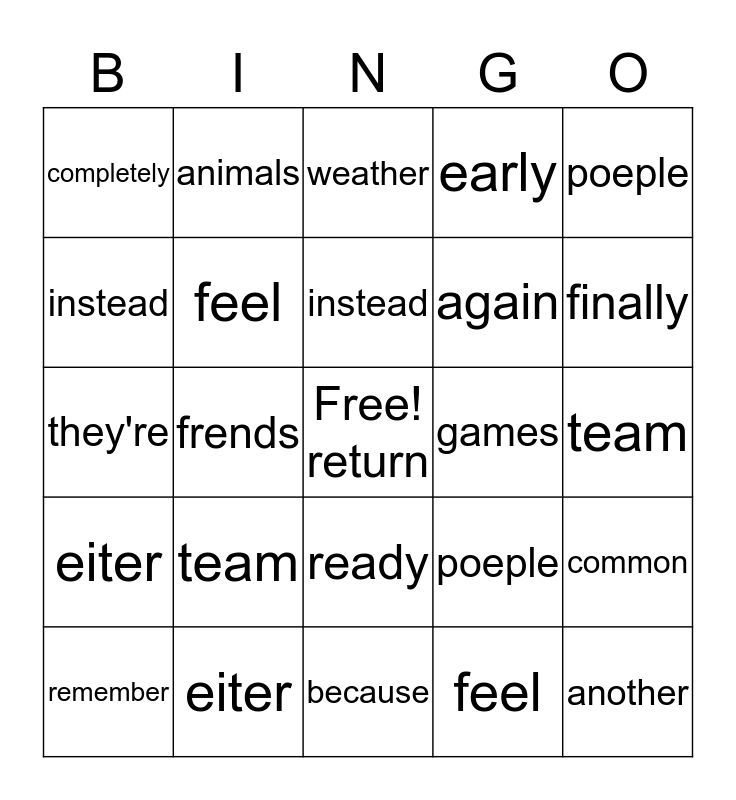 This bingo card has a free space and 24 words: remember, team, instead, feel, poeple, completely, animals, weather, games, team, they're, feel, poeple, common, instead, eiter, because, early, finally, eiter, frends, ready, again and another.