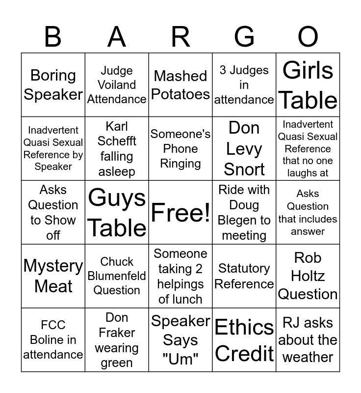 This bingo card has a free space and 24 words: Chuck Blumenfeld Question, Don Fraker wearing green, Someone's Phone Ringing, FCC Boline in attendance, Girls Table, Boring Speaker, Inadvertent Quasi Sexual Reference by Speaker, Judge Voiland Attendance, Ride with Doug Blegen to meeting, Someone taking 2 helpings of lunch, Don Levy Snort, Asks Question to Show off, Statutory Reference, Rob Holtz Question, Karl Schefft falling asleep, Ethics Credit, Asks Question that includes answer, Mashed Potatoes, Inadvertent Quasi Sexual Reference that no one laughs at, Guys Table, RJ asks about the weather, Mystery Meat, 3 Judges in attendance and Speaker Says "Um".