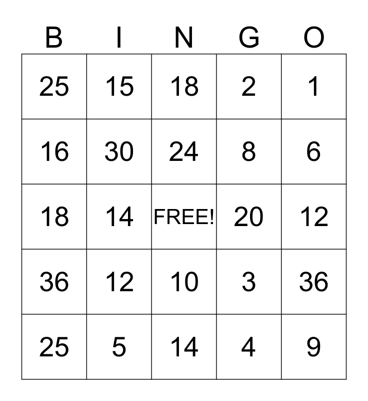 This bingo card has a free space and 24 words: 12, 5, 24, 25, 1, 25, 16, 15, 20, 10, 8, 18, 3, 36, 30, 4, 12, 18, 6, 14, 9, 36, 2 and 14.
