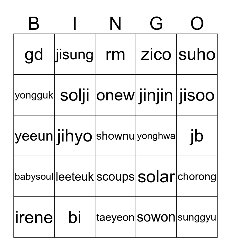 This bingo card has 25 words: leeteuk, taeyeon, onew, irene, suho, gd, yongguk, jisung, yonghwa, scoups, jinjin, yeeun, solar, chorong, solji, sunggyu, jb, rm, jisoo, jihyo, shownu, bi, babysoul, zico and sowon.