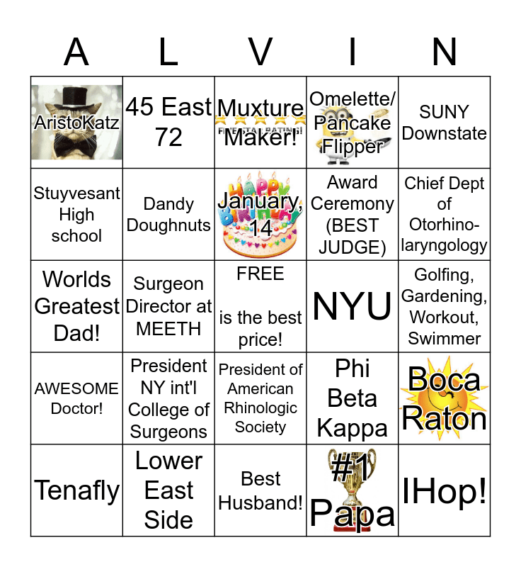 This bingo card has 6 images, a free space and 24 words: President NY int'l College of Surgeons, Lower East Side, January, 14, Tenafly, SUNY Downstate, AristoKatz, Stuyvesant High school, 45 East 72, NYU, President of American Rhinologic Society, Award Ceremony (BEST JUDGE), Worlds Greatest Dad!, Phi Beta Kappa, Boca Raton, Dandy Doughnuts, #1 Papa, Golfing, Gardening, Workout, Swimmer, Muxture Maker!, Chief Dept of Otorhino-laryngology, Surgeon Director at MEETH, IHop!, AWESOME Doctor!, Omelette/ Pancake Flipper and Best Husband!.