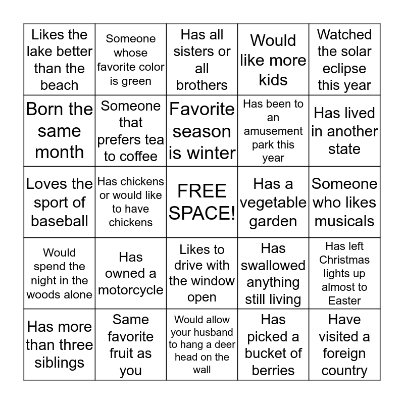This bingo card has a free space and 24 words: Has owned a motorcycle, Same favorite fruit as you, Favorite season is winter, Has more than three siblings, Watched the solar eclipse this year, Likes the lake better than the beach, Born the same month, Someone whose favorite color is green, Has a vegetable garden, Likes to drive with the window open, Has been to an amusement park this year, Loves the sport of baseball, Has swallowed anything still living, Has left Christmas lights up almost to Easter, Someone that prefers tea to coffee, Has picked a bucket of berries, Someone who likes musicals, Has all sisters or all brothers, Has lived in another state, Has chickens or would like to have chickens, Have visited a foreign country, Would spend the night in the woods alone, Would like more kids and Would allow your husband to hang a deer head on the wall.