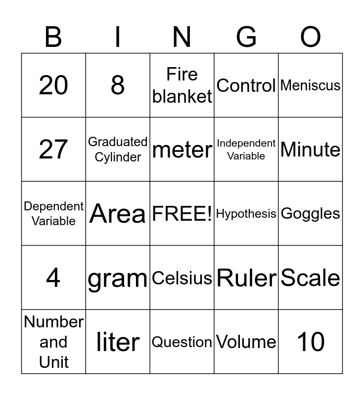 This bingo card has a free space and 24 words: gram, liter, meter, Number and Unit, Meniscus, 20, 27, 8, Hypothesis, Celsius, Independent Variable, Dependent Variable, Ruler, Scale, Graduated Cylinder, Volume, Goggles, Fire blanket, Minute, Area, 10, 4, Control and Question.