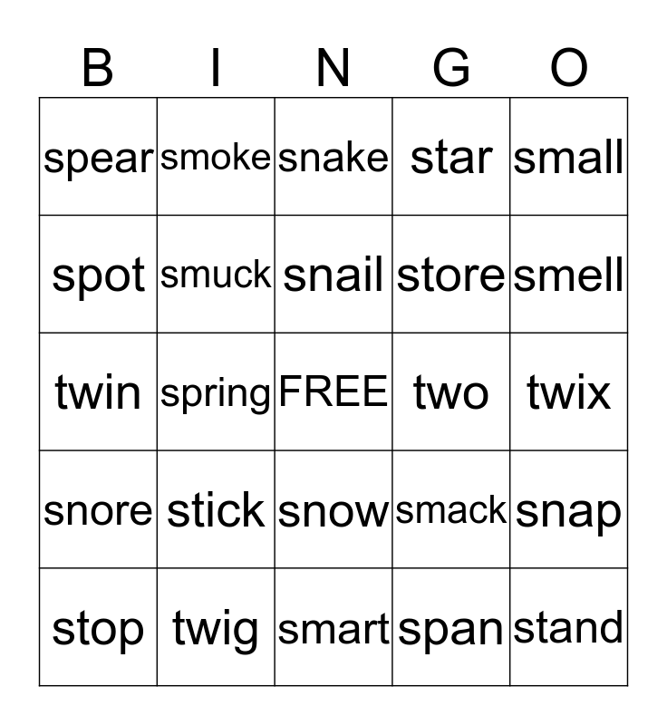 This bingo card has a free space and 24 words: stick, twig, snail, stop, small, spear, spot, smoke, two, snow, store, twin, smack, snap, smuck, span, twix, snake, smell, spring, stand, snore, star and smart.